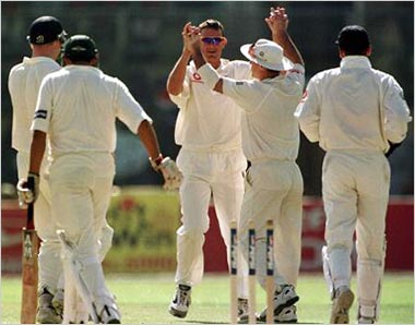 Ashley Giles celebrates taking the wicket Shahid Afridi during the third Pakistan vs England Test at the National Stadium, Karachi, Pakistan.