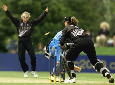 New Zealand wicketkeeper Rebecca Rolls attempts a stumping as bowler Catherine Campbell appeals.