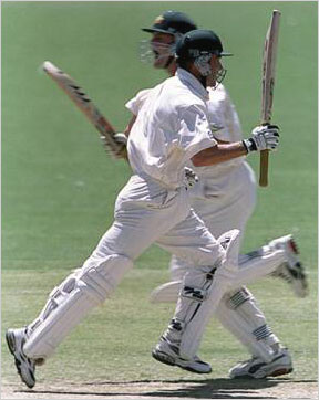 The streak goes on...For the first time in the current Test series between Australia and West Indies the match entered the last day. The sole point of interest on this final day was whether the West Indians could make a remarkable turnaround and snatch victory from the jaws of defeat.Damien Martyn and Justin Langer cross over for a single. Hamish Blair/ALLSPORT |