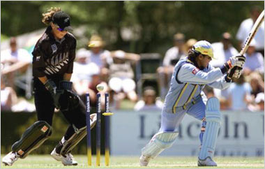 Sunita Kanajia is bowled for a duck as New Zealand wicketkeeper Rebecca Rolls looks on.