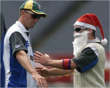 Glenn McGrath and Michael Slater (dressed as Santa) warm up, during training at the Melbourne Cricket Ground on the eve of the Boxing Day Test against West Indies.