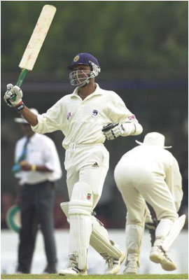 Marvan Attappatu of Sri Lanka celebrates reaching his double century during the 2nd day of the 1st Test between Sri Lanka and England at the Galle International Cricket Stadium, Galle, Sri Lanka.