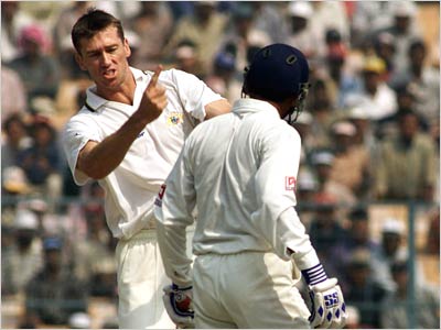 Australia paceman Glenn McGrath gives Venkatapathy Raju the marching orders. Raju was trapped lbw, by a reverse-swinging ball of full length. India's first innings score in the second Test then was 129 for 9, and another defeat inside three days looked imminent.