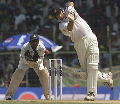 Hay - Day !Wicketkeeper Samir Dighe watches anxiously as Mark Waugh plays an elegant drive on the first day of the third and final cricket Test between India and Australia at the Chidambaram stadium, Madras. Waugh went on to make 70 runs.