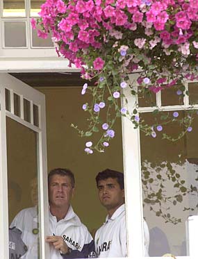 India coach John Wright and skipper Sourav Ganguly check out the weather from the pavilion as play is delayed on the second day of the second Test against England, at Trent Bridge, on Friday.