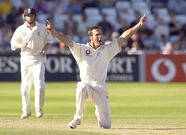 Michael Vaughan celebrates getting the wicket of Ajit Agarkar.