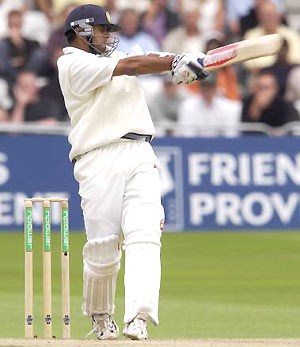 Dravid pulls Flintoff through mid-wicket to record another industrious 80-ball fifty. He went on to score his 11th Test hundred.