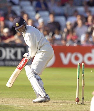 Ganguly is bowled by Steve Harmison one short of a well-deserved century.