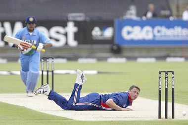 Darren Gough watches the ball pass him on its way to the fence.Opener Virender Sehwag got off to a breezy start but was dismissed for 16.