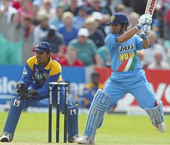 Sachin Tendulkar despatches a ball to the fence as wicket keeper Sangakkara looks on.