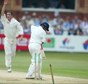 India got off to a good start, with both Virender Sehwag and Wasim Jaffer piling on the runs at a quick pace. But then Simon Jones struck, bowling Sehwag for 27. India were 61 for 1.