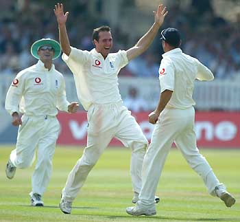 Vaughan rejoices after claiming the wicket of Wasim Jaffer. The opener scored a strokeful 53, but then gifted his wicket away.