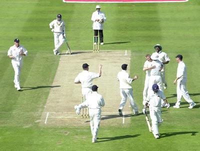 Matthew Hoggard celebrates getting the wicket of Kumar Sangakkara.
