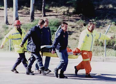 Rescue workers carry the body of former South African cricket captain Hansie Cronje following the plane crash in which he lost his life.