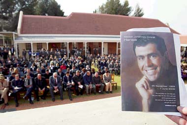 Mourners sit outside Grey College School Hall during the funeral of former South African cricket captain Hansie Cronje in Bloemfontein, South Africa.
