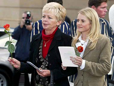 Hansie Cronje's mother Sanmarie and his wife Bertha arrive at Grey College shortly after the funeral service.