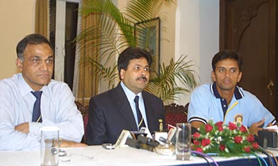 Board of Control for Cricket in India secretary Niranjan Shah, tour manager Rajiv Shukla and India vice-captain Rahul Dravid address the media at the Taj Mahal hotel in Mumbai on the eve of the team's departure for England.