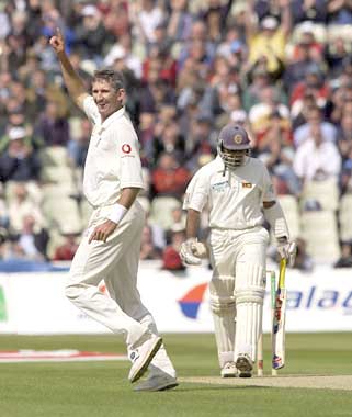Andrew caddick celebrates the wicket of Sri Lankan skipper Sanath Jayasuriya for 8.