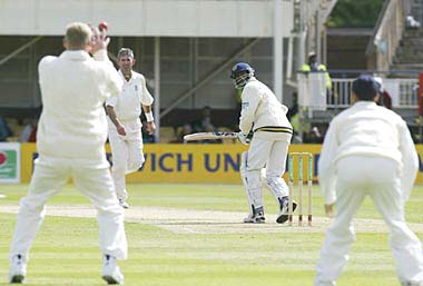 Andrew Caddick gets the wicket of Russell Arnold caught by Andrew Flintoff.