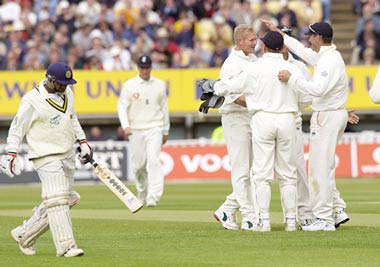 Matthew Hoggard celebrates the wicket of Aravinda De Silva caught by Trescothick for 10.