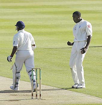 England's Alex Tudor celebrates getting the wicket of Hashan Tillakaratne LBW for 20.