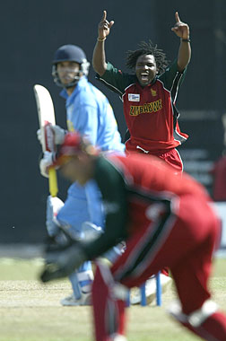 Douglas Hondo celebrates dismissing Yuvraj Singh in the ICC Champions Trophy match between India and Zimbabwe at the Premadassa Stadium in Colombo.
