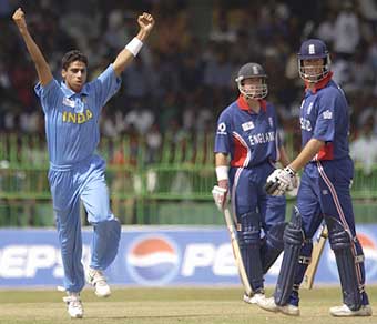 India medium pacer Ashish Nehra raises his arms in triumph after claiming the wicket of England opener Marcus Trescothick during the ICC Champions Trophy match on Sunday. India won the match by eight wickets and entered the semi-final of the tournament.