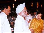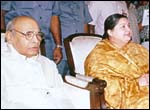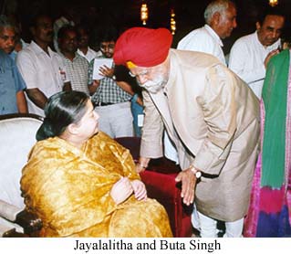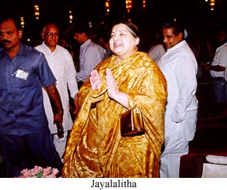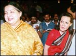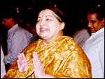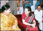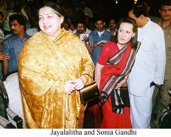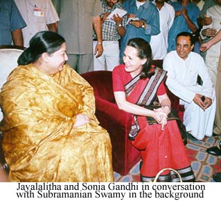 Sonia scampered across and took her place next to Jayalalitha. They smiled at one another and made some polite conversation that nobody heard but everybody wrote about. Then as suddenly as it had begun, it was over. Sonia got up and hurried out and the Queen reigned alone, smiled beatifically some more and called her meeting with Sonia a 'political earthquake' -- thereby making the only remotely significant statement of the evening.