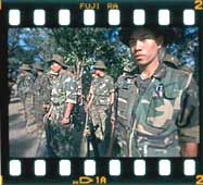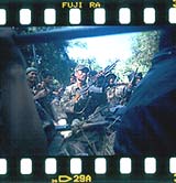 Our haversacks full of essentials for the next few days, Photographer Nilayan Dutta and I waited for the morrow with apprehension... Day 1 YUMNAM Rupachandra, correspondent of The Statesman, arrives with four others -- Khelen Thokchom, editor of Sangai Express, a local English daily, two photographers, and an ANI correspondent -- at 0600 hours IST. We set off in a Tata Sumo. An hour reaches us to a small town. After a bit of breakfast, we turn off the highway, onto a dirt track. We arrive at a village and are told to unload our rucksacks and wait. Ten minutes later, a man in a heavy jacket rides up on a bicycle. He could have been one of the several onlookers gathered around us but for one thing: a small Kenwood two-way radio around his neck. He is Inga, and chats animatedly with our local friends in Manipuri. Rupachandra translates for our benefit: "An armed posse will escort us from this point." Half an hour later, guerrillas arrive. In jungle fatigues, armed with AK-56s, the band of 11 boys, all of them in their early 20s, march into the village in a single file. The leader, also carrying a radio, is a lance corporal in the UNLF hierarchy. He instructs his boys to pick up our luggage. I gather we are VIPs to them, so we are exempted from carrying our own bags. With two 'scouts' in front, the procession begins. We march in single file. The pace, as it happens in the beginning of any journey on foot, is brisk. Soon we begin to sweat -- and off come our sweaters and heavy jackets. After an hour or so, the water bottles come out. So do biscuits and chocolates. We city-types are beginning to tire and wonder what we have got ourselves into. On the way, villagers stare at us, as if watching an exotic species. They are used to armed men walking through, but not 'civilians' like us. After two-and-a-half hours, we reach the village where we are to have lunch. All of us lie down on the cool grass. Lunch is rice and dal. It has never tasted so great anywhere before! CHAIREN is checking the route ahead for enemy movement. "I am not so much worried about the security forces. What I am concerned about is our rivals attacking unexpectedly," he says. Apparently, other groups such as the Issac-Muivah faction of the National Socialist Council of Nagaland -- bitter enemies of the UNLF -- control some areas en route. We begin walking again, this time silently. As dusk dissolves into darkness, the fear in my mind accentuates. Everyone is quiet. What if there is an attack? Are these guys capable of warding it off? The walk continues for the next four hours with little or no banter among us. Around 2000 hours, we reach a riverbank. Chairen is constantly in touch with his base on radio. We wait. A vehicle is supposed to pick us up here. After 30 minutes a Shaktiman truck wades through the waist-deep water and comes to our side. We clamber on to the open truck, grateful that we don't have to walk anymore.