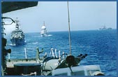 After being devoid of the glorious presence of a "live" carrier, Bombay hosted Foch a couple of kilometres behind the Gateway of India for almost a week. On February 28, the ship sailed into the high seas with several thousand men, aircraft, helicopters -- and a rediff.com team.
