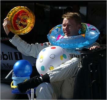 Mika Hakkinen of Finland and McLaren is presented with some leisure goods for his upcoming year off.