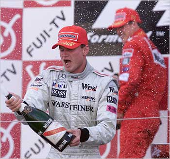 David Coulthard of Great Britain and McLaren celebrates his third place finish and runner up in the drivers championship.