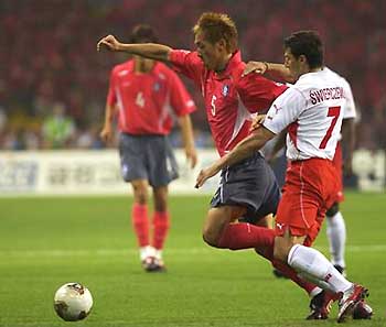 II Nam Kim of South Korea is tackled by Piotr Swierczewski of Poland during the Group D match. South Korea scored a suprise 2-0 victory and registered their first win in the finals.