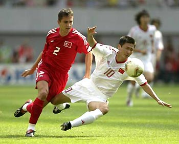 Emre Asik of Turkey (left) and Haidong Hao of China make a charge for the ball during the first half of the group C match. Turkey