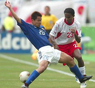 Tomokazu Myojin of Japan jabs at an advancing Jose Clayton of Tunisia during the group H decider. Japan won 2-0 and qualified for the second round.