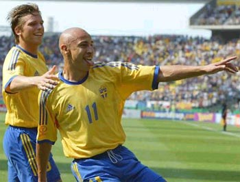 Henrik Larsson celebrates after putting Sweden into the lead early, in the second round match against Senegal, at the Big Eye stadium, Oita, Japan. Senegal went on to win 2-1 in extra-time.