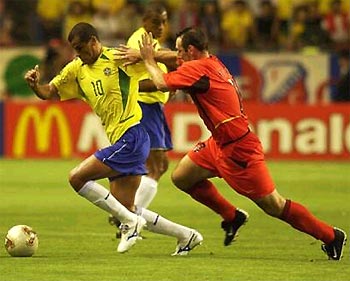 Yves Vanderhaeghe of Belgium makes a challenge from behind on Brazil's Rivaldo during the second round match. Rivaldo and his team mate Ronaldo both scored in a 2-0 victory, which set up a quarter-final match against England.