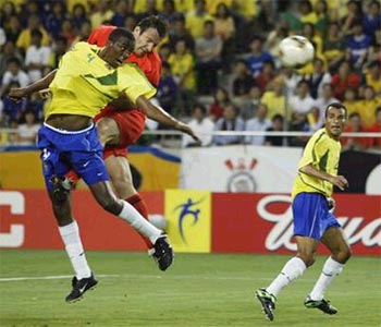 Belgium striker Marc Wilmots climbs over Roque Junior and heads into the Brazil goal. However, the goal was disallowed as the referee ruled Wilmots had fouled Junior.