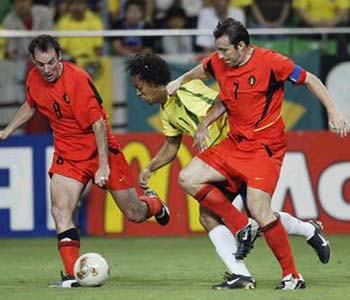 Brazil's young striker Ronaldinho tries to dribble past Wilmots.