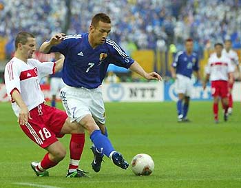 Ergun Penbe of Turkey tries to tackle Hidetoshi Nakata.