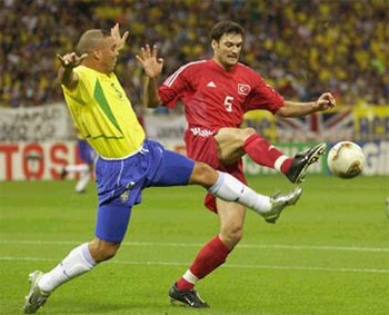 Alpay Ozalan of Turkey does well to cut off a long ball before Brazil's ace striker Ronaldo can get to it, during the second semi-final of the 2002 FIFA World Cup. Brazil won 1-0 to set up a dream final against Germany. The two aristocrats of world football will meet for the first time in World Cup history.