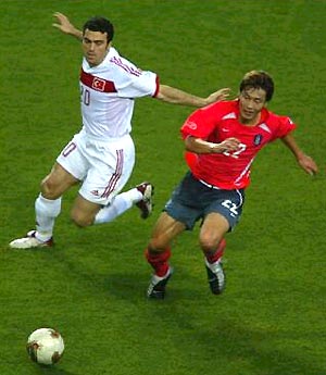 Hakan Unsal of Turkey (left) battles for the ball with Chong Gug Song.