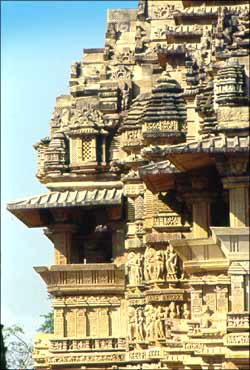 The Chandelas, who were an important central Indian power at the cusp of the last millennium, ruled from Jajhauti. But the temples came up at Khajuraho -- the word Khajuraho is apparently derived from the numerous khajur or date palms that flourished here. BACK NEXT Photographs: Phal S Girota |