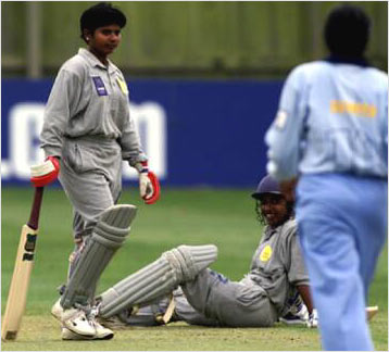 Champa Sugathadasa (left) is run-out after she and partner Hiroshi Abeysinghe both ended up at the same end.