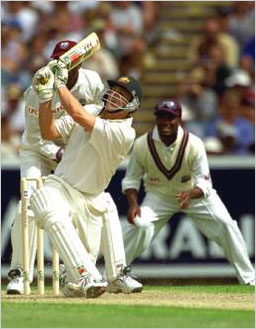 It's Waugh AgainGilchrist despatches the cherry to the fence. The final session of play saw Steve Waugh and Adam Gilchrist come out in positive mood, in a bid to put runs on the board. As a strategy, it seemed the way to go -- the West Indies bowling was a mixture, through the day, of the very good and the very wayward.Robert Cianflone/ALLSPORT |