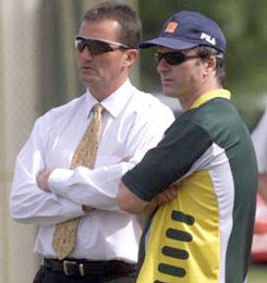 Australian captain Steve Waugh chats with Andrew Hilditch Australian selector during the Australian net session ahead of the first Test.