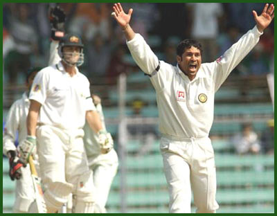 Sachin Tendulkar screams as the ball raps Gilchrist on the pads. The appeal was turned down and the keeper went on to score his maiden ton in India.