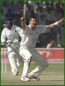 Australia fast bowler Michael Kasprowicz appeals unsuccessfully against Dinesh Mongia (not in picture).