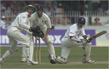 England wicketkeeper Alec Stewart watches as Sri Lanka tailender Chaminda Vaas sweeps on his way to 19 not out.