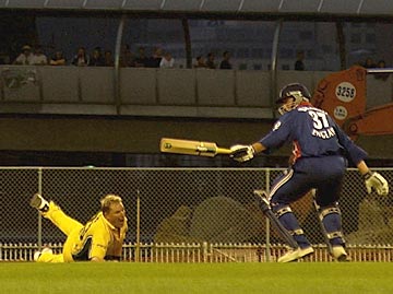 Warne, diving to field a ball, dislocated his right shoulder. He was carried off the field.